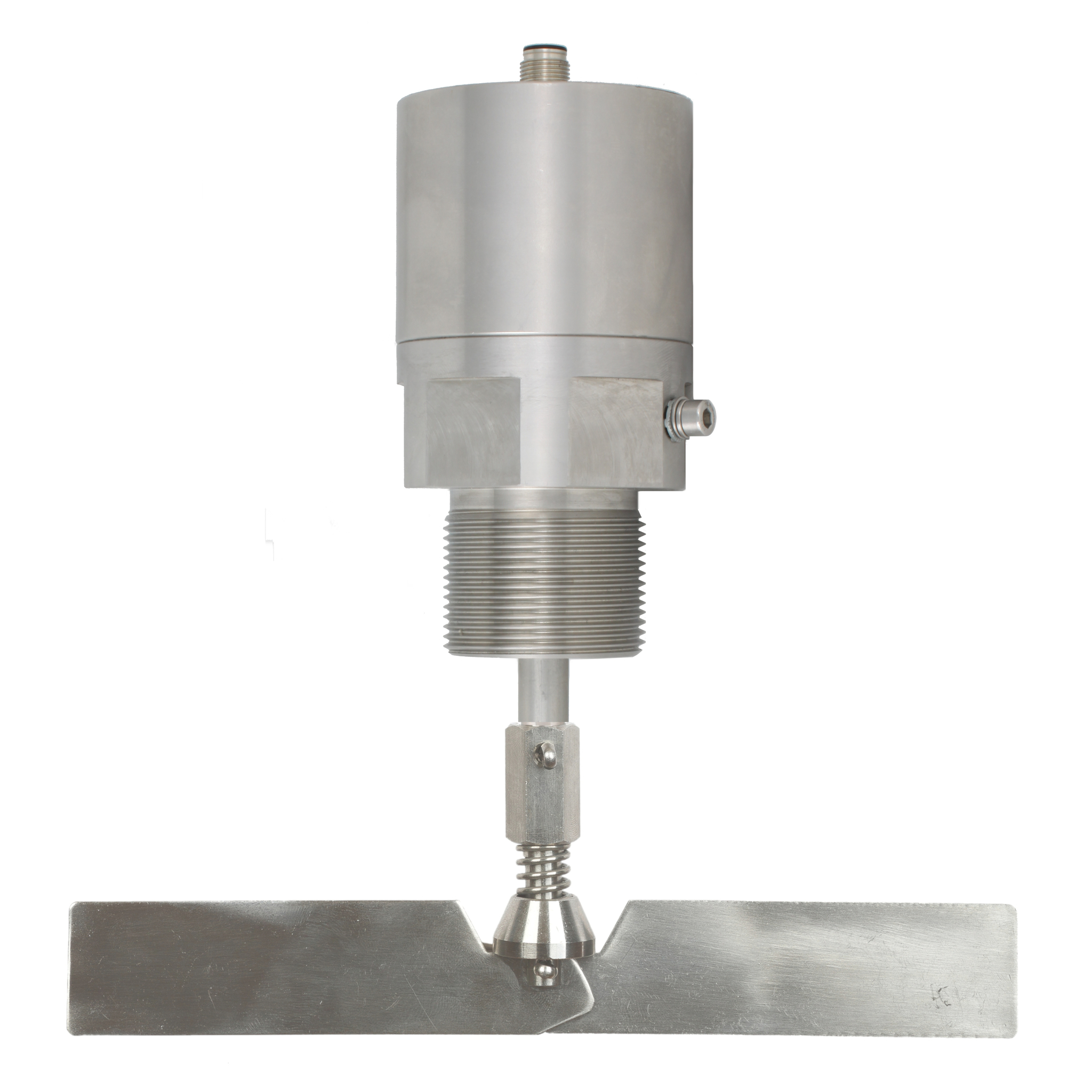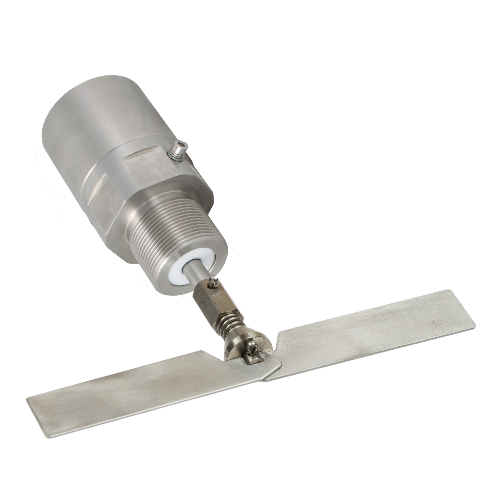 Механический ротационный датчик предельного уровня сыпучих материалов в корпусе из нерж. стали, -50 +80 С, Рmax=10 bar, IP67, вибростойкость до 29g, лопасть складная двусторонняя 28х200 мм, нерж. сталь, скорость вращения 15 об/мин, 24 VDC, соединение - резьба 1 1/2", нерж. сталь, удлинение 115 мм, нерж. сталь, разъем M12, выход - оптрон.